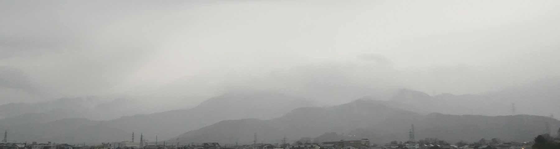 朝から雨模様の丹沢表尾根のやまなみです。雨雲が広がり、稜線は全く見えません。今日は雨模様の一日となる予報です。