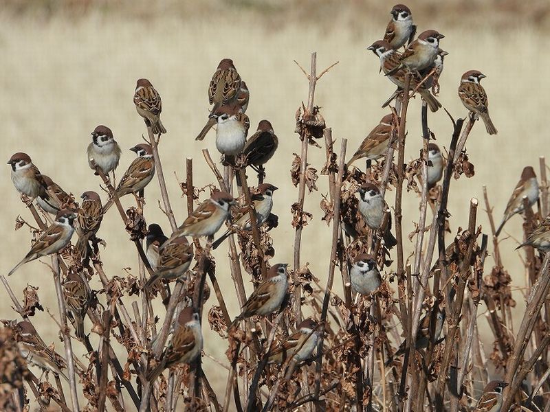 今月はやすらぎの池では沢山のコガモやマガモなどが休んでいましたし、大根川沿いではスズメやオオカワラヒワ、ツグミなどが至る所で見られました。全体で32種が観察できました。